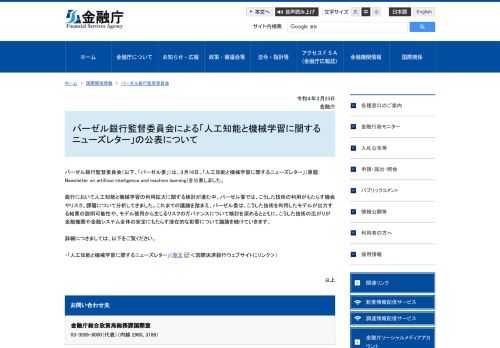 バーゼル銀行監督委員会による「人工知能と機械学習に関するニューズレター」の公表について:金融庁
