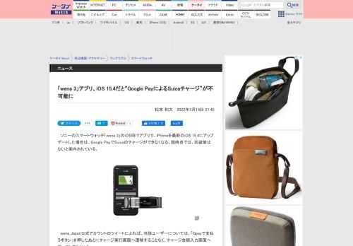 「wena 3」アプリ、iOS 15.4だと“Google PayによるSuicaチャージ”が不可能に - ケータイ Watch
