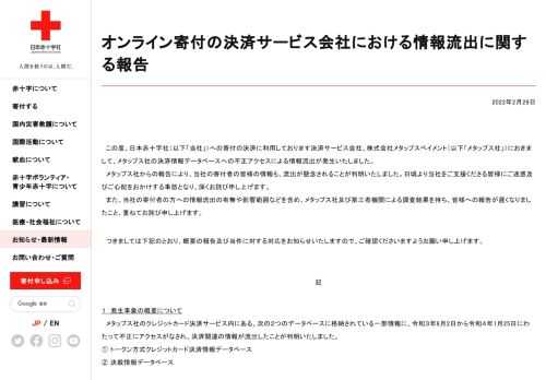 オンライン寄付の決済サービス会社における情報流出に関する報告|日本赤十字社からのお知らせ|おしらせ・最新情報|日本赤十字社
