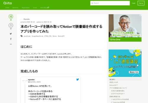 本のバーコードを読み取ってNotionで読書録を作成するアプリを作ってみた - Qiita
