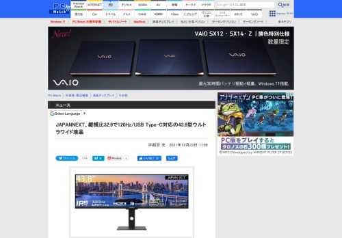JAPANNEXT、縦横比32:9で120Hz/USB Type-C対応の43.8型ウルトラワイド液晶 - PC Watch
