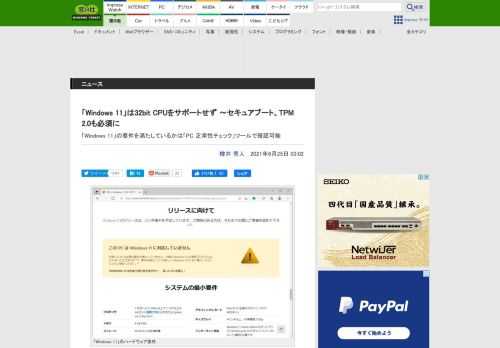 「Windows 11」は32bit CPUをサポートせず ~セキュアブート、TPM 2.0も必須に - 窓の杜