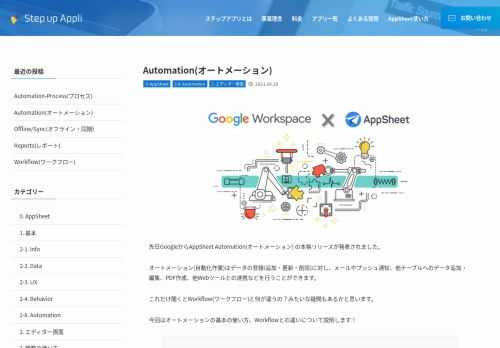 ![かねてよりPreviewプログラムとして様々なユーザフィードバックを受け付けていた AppSheet Automation が、4/13 に正式リリースとなりました。 Automation: No-Code, AppSheet and Google Cloud | Google Cloud Blog 既存の自動化機能が大幅に増強され、加えてGoogleならではの様々なファンクションが含まれた魅力的な新機能リリースとなりました。既存のワークフローだけでも様々なタスク、アクションを自由自在にコントロールすることが可能ですが、Automationの登場によりさらなる機能が追加されるに至りました。 これまではワークフローから別のワークフローをコントロールすることができないなどの制限がありましたが、これが実現可能となることに加え、Google Drive内のファイル・フォルダデータとの連携、外部アプリとのよりシームレスな連携など数々の新機能が追加されています。 一方で Automation というキーワードから、国内外の各所でいわゆる RPA や iPaaS 製品群との比較が考察される状況が生]()