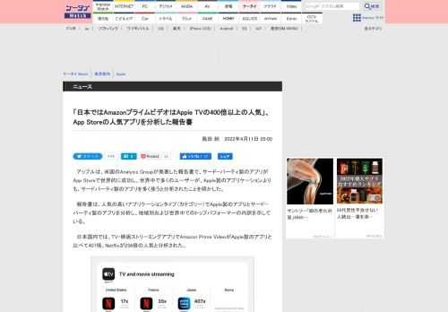 「日本ではAmazonプライムビデオはApple TVの400倍以上の人気」、App Storeの人気アプリを分析した報告書 - ケータイ Watch